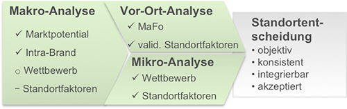 Makro-Analyse wird eine Standortoption auf Basis der verfügbaren Informationen bewertet. Die Einschätzung von Standortpotential, Wirkung auf bestehende Standorte (Kannibalisierung) und Verträglichkeit mit der Netzplanung entscheidet über eine weitere Untersuchung vor-Ort.