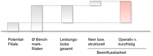 Marketperformance Benchmarking liefern einen ersten objektiven Leistungsmaßstab zur Bewertung. Die Analyse der Einflussgrößen und Standortfaktoren ermöglicht dann die Aufteilung strukturelle Defizite und direkt beeinflussbare Verbesserungspotentiale (siehe nachstehend)
